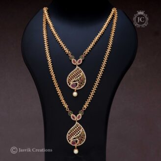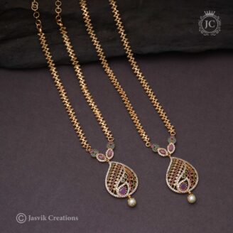 Long Muggappu Chain: A long, box-style gold chain featuring a side-set “Muggappu” (ornamental side piece) made of four connected crystal flowers.