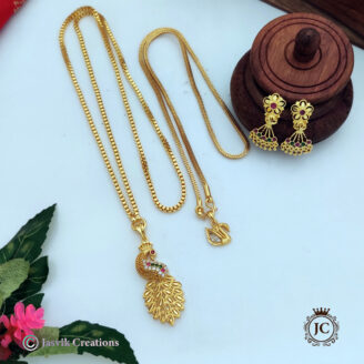 Long Muggappu Chain: A long, box-style gold chain featuring a side-set “Muggappu” (ornamental side piece) made of four connected crystal flowers.