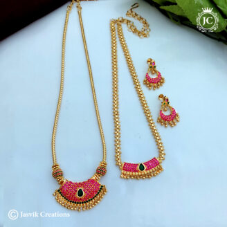 Long Muggappu Chain: A long, box-style gold chain featuring a side-set “Muggappu” (ornamental side piece) made of four connected crystal flowers.
