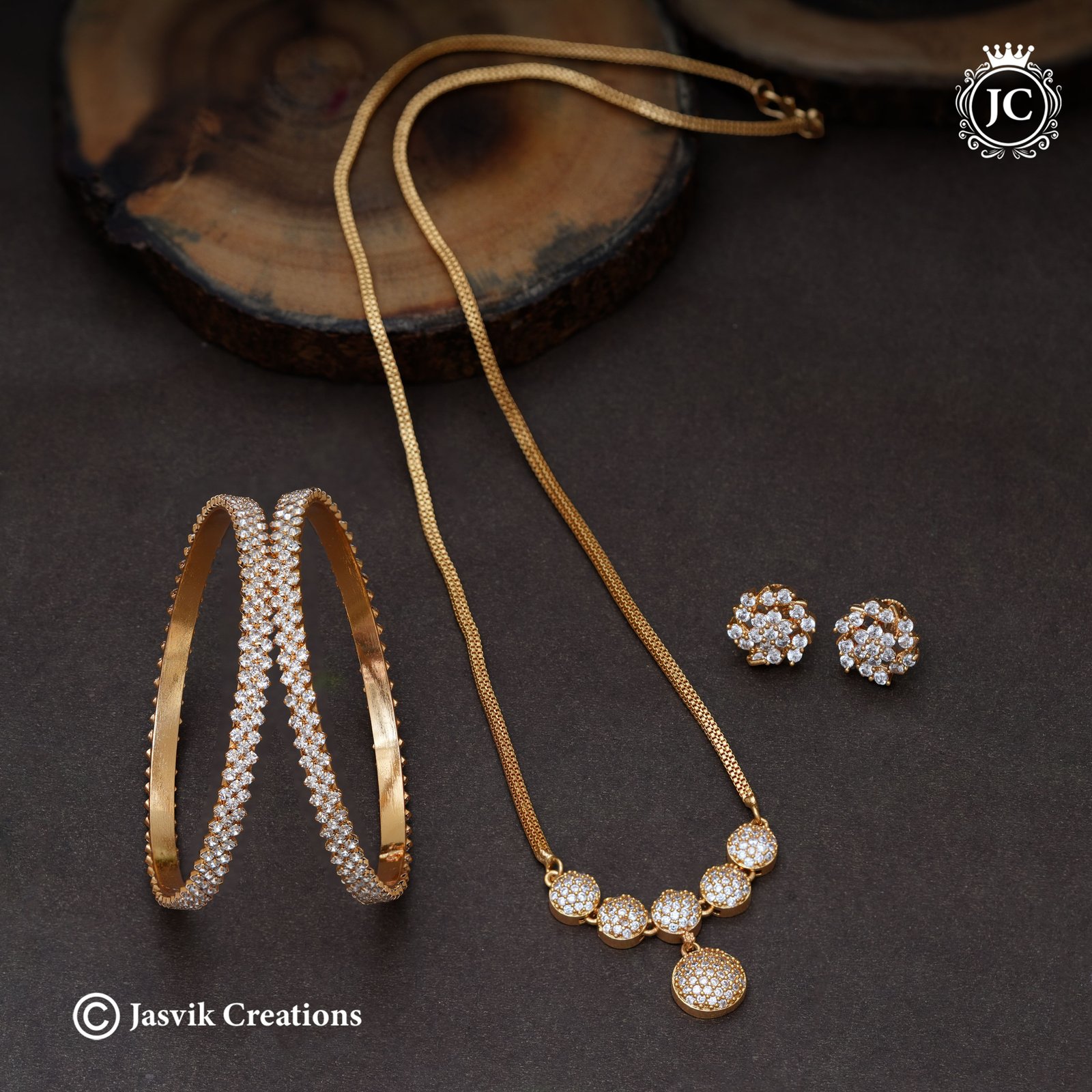 Design & Stones: The pieces feature intricate, classic designs heavily embellished with American Diamonds (AD), also known as Cubic Zirconia (CZ). These high-quality stones are cut to reflect light brilliantly, giving the authentic look of real diamonds. * Finish: The jewelry has a rich gold-tone finish applied through Micro Plating, which is a high-quality electroplating process that applies a thicker layer of gold for enhanced durability and a premium, long-lasting shine.