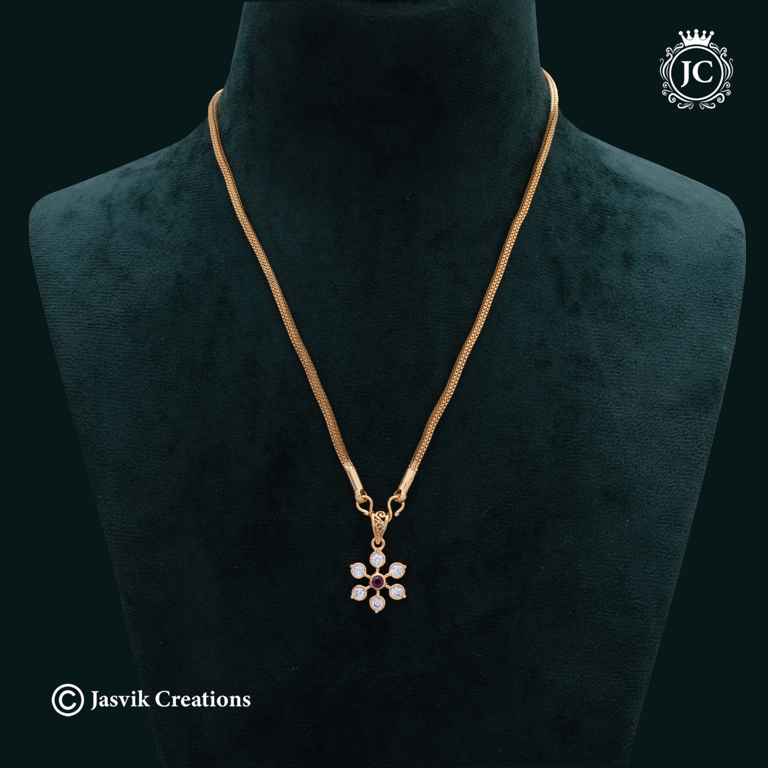 The central feature is the pendant, which is a stylized floral design. It has a cluster of seven stones arranged in a flower pattern. At the center is a single, prominent red stone, which provides a beautiful pop of color. The surrounding six petals are set with small, sparkling white stones, giving the piece a “diamond look.” The white stones are likely American Diamonds or high-quality cubic zirconia, designed to mimic the brilliance of real diamonds.