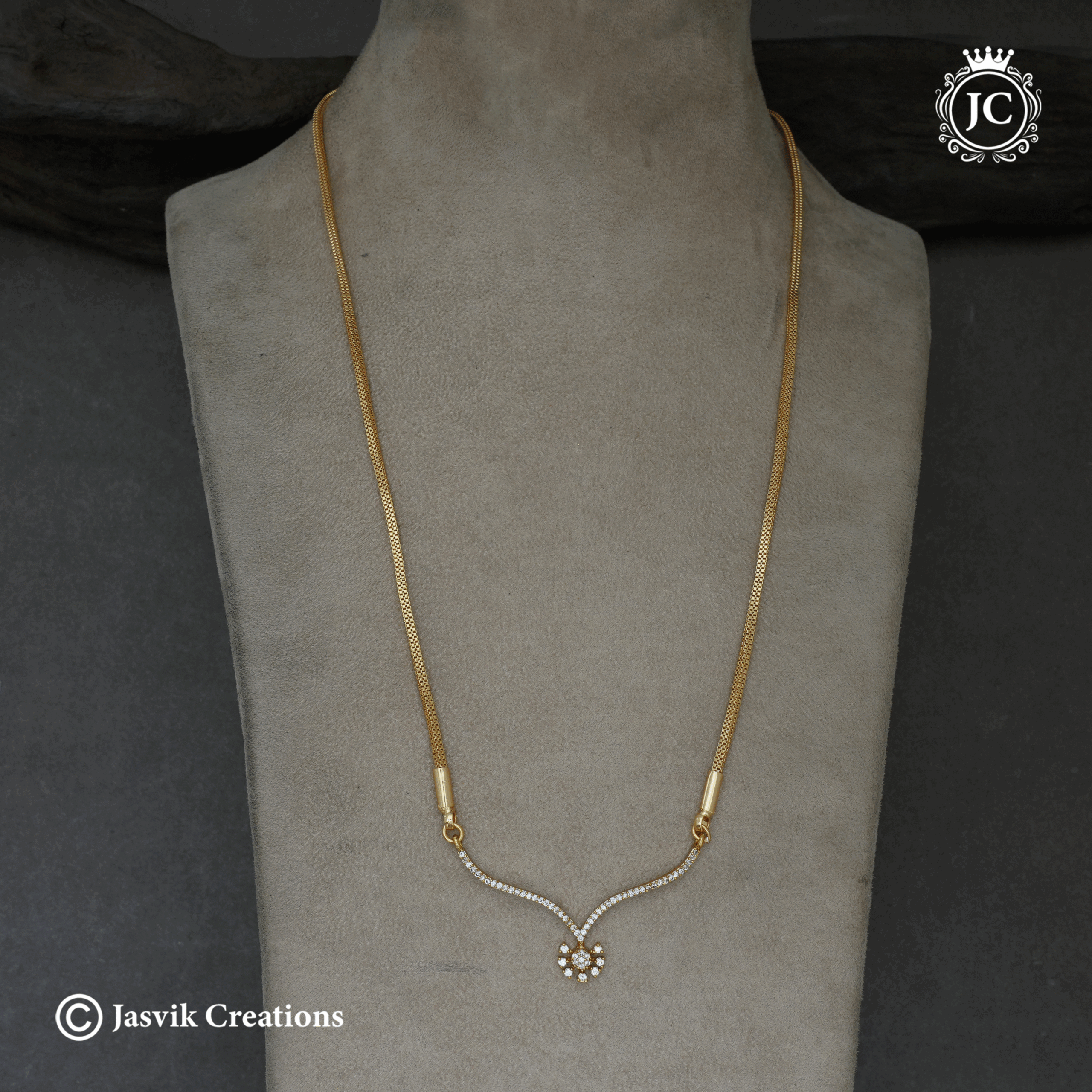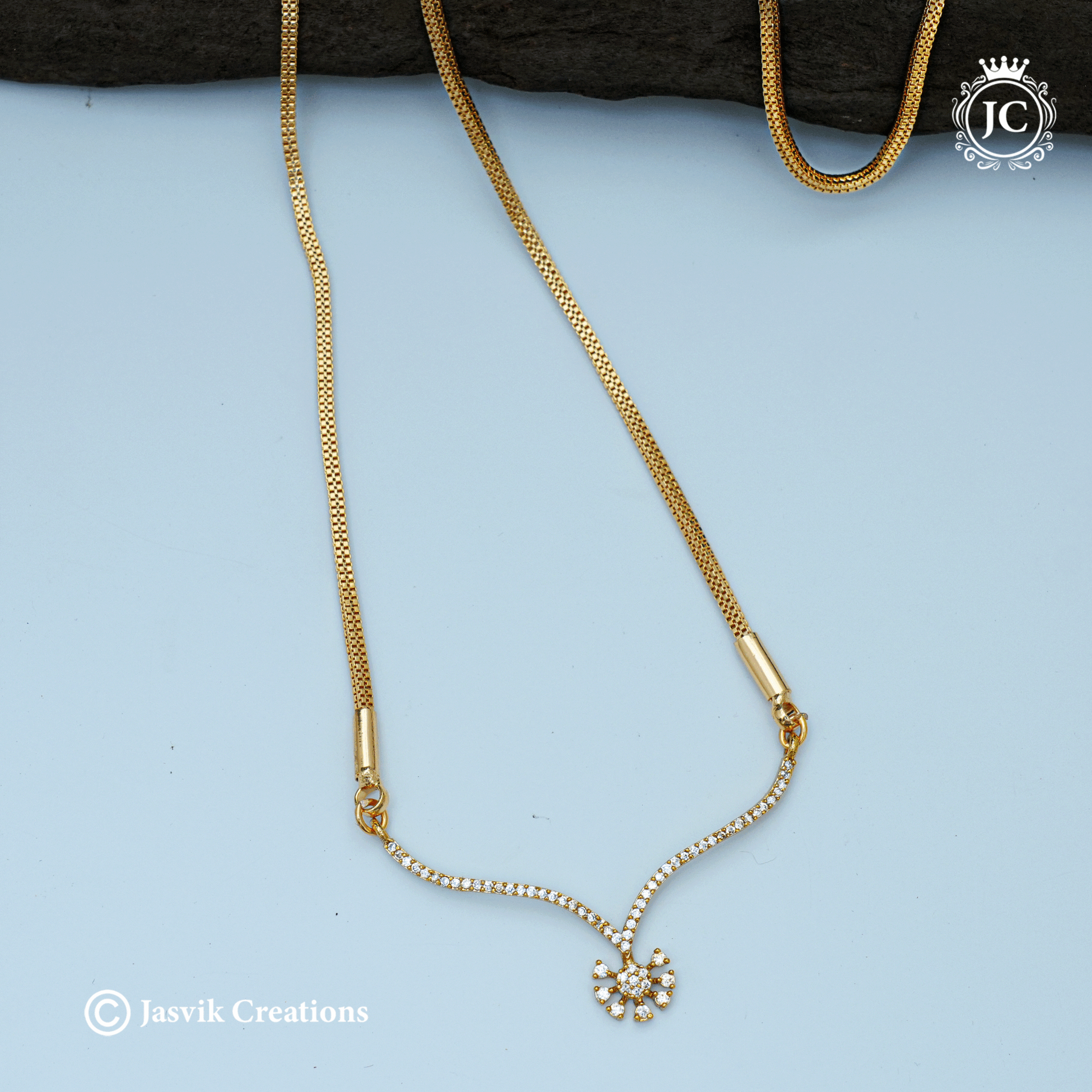 The necklace features a sleek, flexible snake-style or box chain that transitions to a delicate, curved centerpiece. This central element is entirely paved with brilliant white stones (diamond replicas or cubic zirconia), culminating in a small, stylized floral or star-shaped motif at the bottom. The absence of a large pendant or “dollar” makes this a more understated and everyday-wearable piece, blending traditional gold tones with modern diamond-like sparkle.