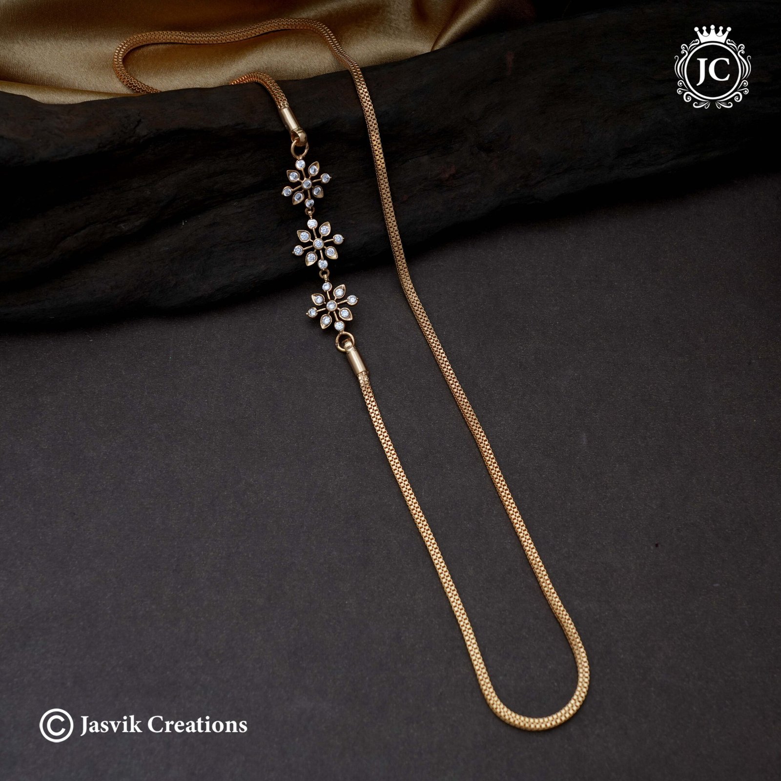 A traditional, thick gold-plated chain (Mugappu Chain) featuring a distinctive diamond-replica side pendant (mugappu). The side pendant is a column of three sparkling, floral-design motifs, making it an elegant and culturally significant piece of South Indian imitation jewelry.