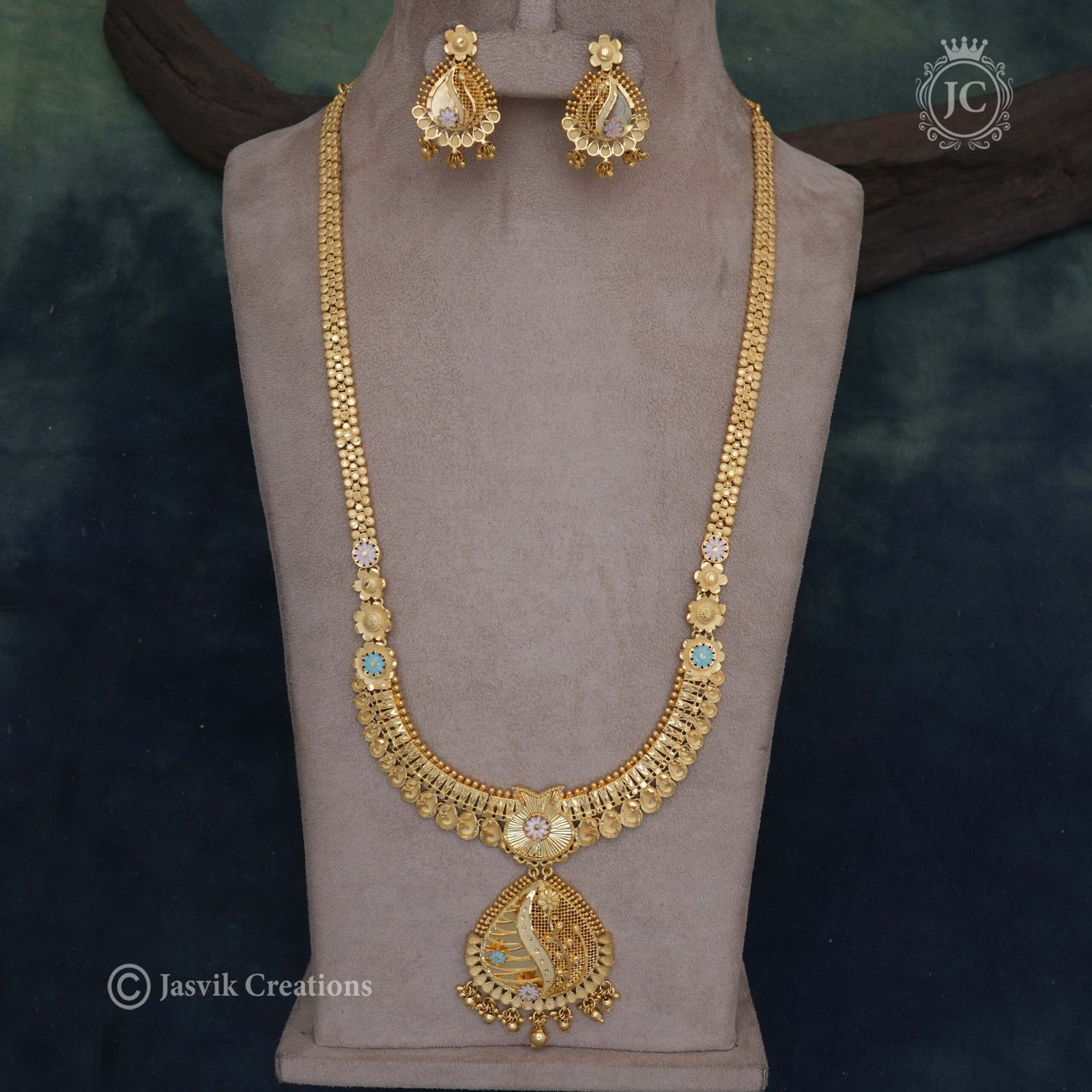 Plating and Finish: The jewelry is crafted using a “forming” or “micro-plating” process, which applies a thick and high-quality layer of gold onto a base metal (usually a copper-brass alloy). This gives the haram a lustrous, bright gold finish that closely resembles authentic gold. This type of plating is known for its durability and resistance to tarnish, making it a reliable choice for special occasions.