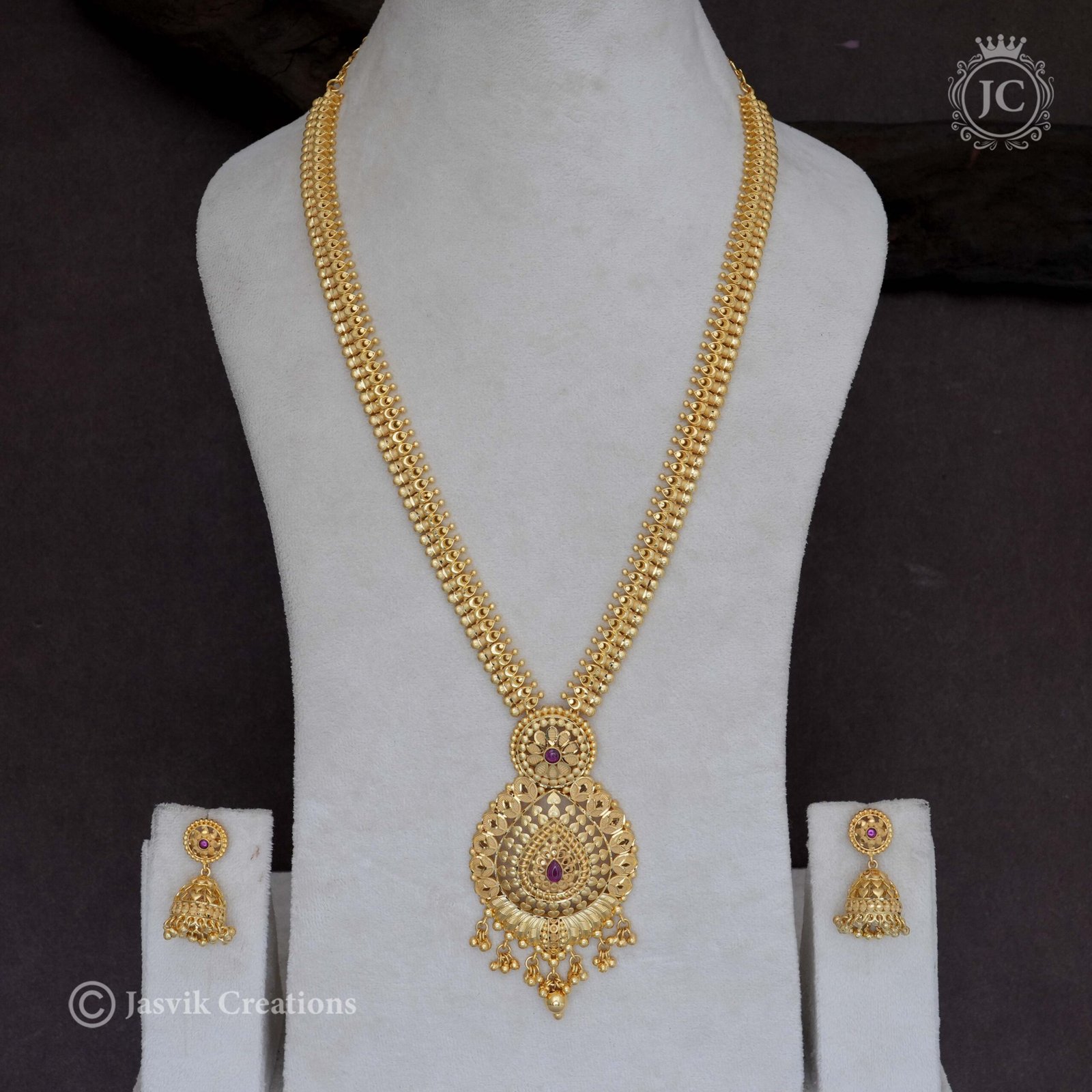 Style: As a long necklace, this haram is designed to be a grand piece of jewelry. Its substantial design and brilliant gold finish make it a perfect complement to traditional attire like sarees and lehengas. It is an ideal choice for celebrations, weddings, and formal events where a touch of traditional elegance is desired. The necklace is typically sold as a set with matching earrings that mirror the design of the pendant.