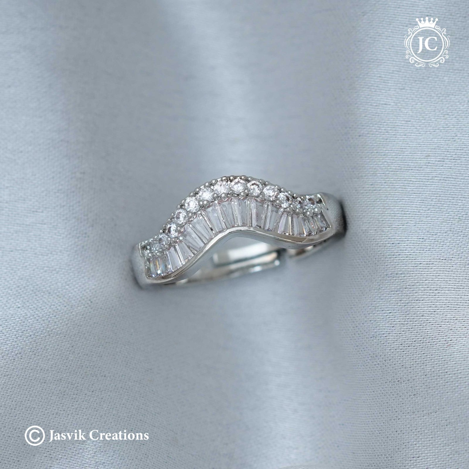 Stones: The entire face of the curved element is paved with sparkling clear stones (likely American Diamonds or CZ). The design cleverly uses a combination of cuts: baguette-cut stones are set centrally and longitudinally to define the curve, while smaller round brilliant-cut stones frame the baguettes and edge the perimeter, maximizing the sparkle.