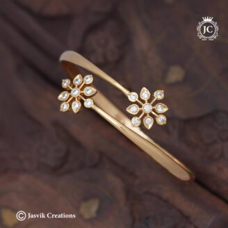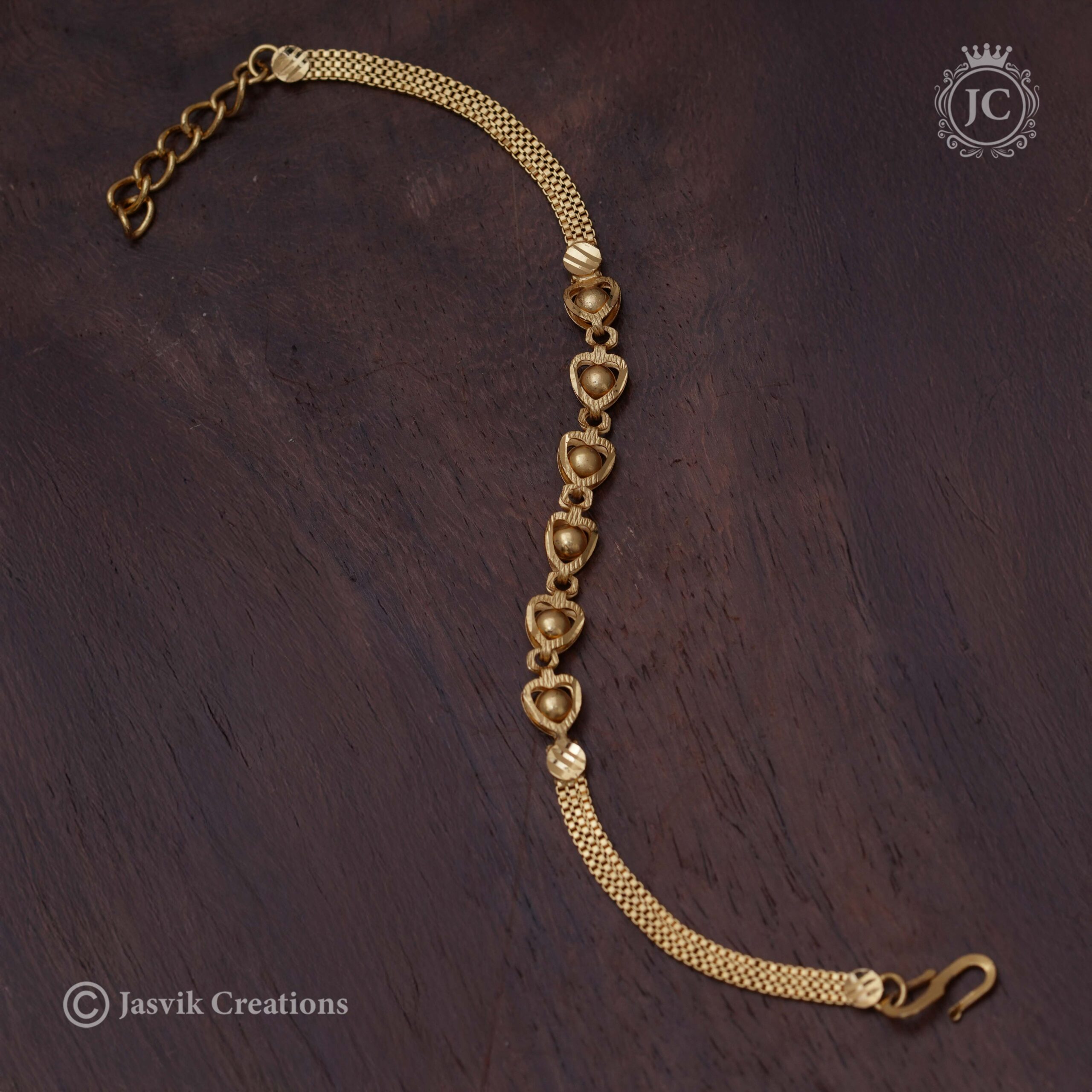 The JCBT056 is a gold-plated bracelet with a unique design featuring interconnected heart and flower-like motifs. Crafted with a copper base, it is finished with high-quality, long-lasting micro gold plating for a rich, real-gold look. The chain is designed to be anti-allergic and safe for skin.