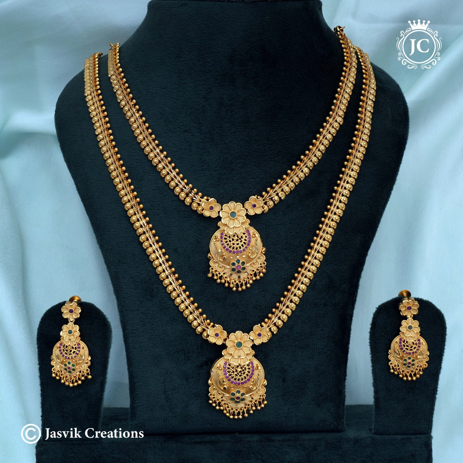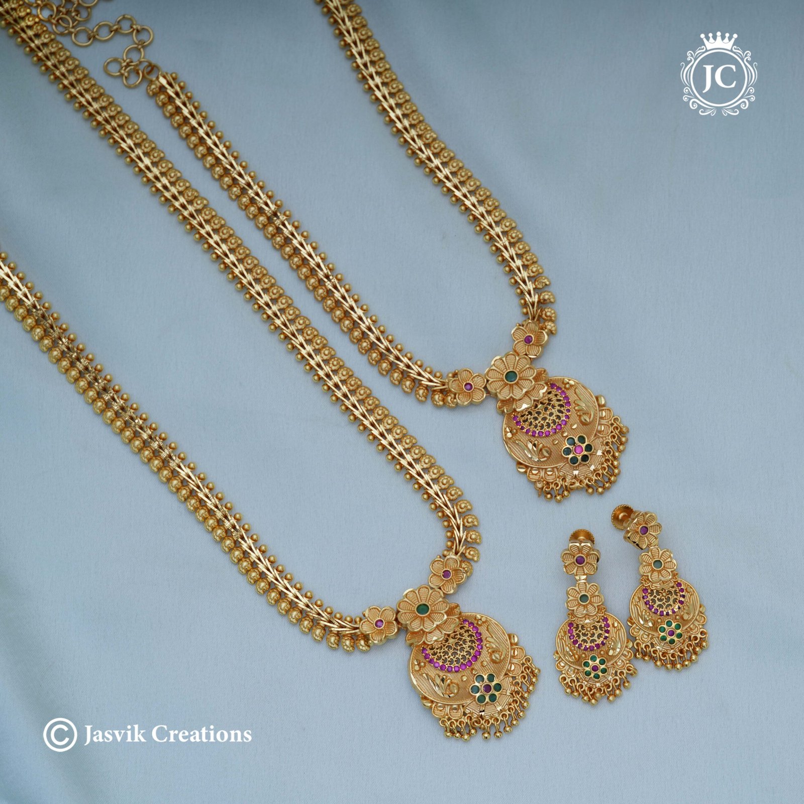 A matched set of two long, fine chains featuring continuous rows of polished gold beads. Each chain is anchored by a semi-circular pendant featuring a detailed floral cluster with ruby/maroon and green stones, and finished with delicate gold bead drops (ghungroos). The set is completed with matching long, dangling earrings that echo the detailed floral motif and gold-bead work of the pendant. This combo set offers a coordinated, traditional, and multi-layered look.