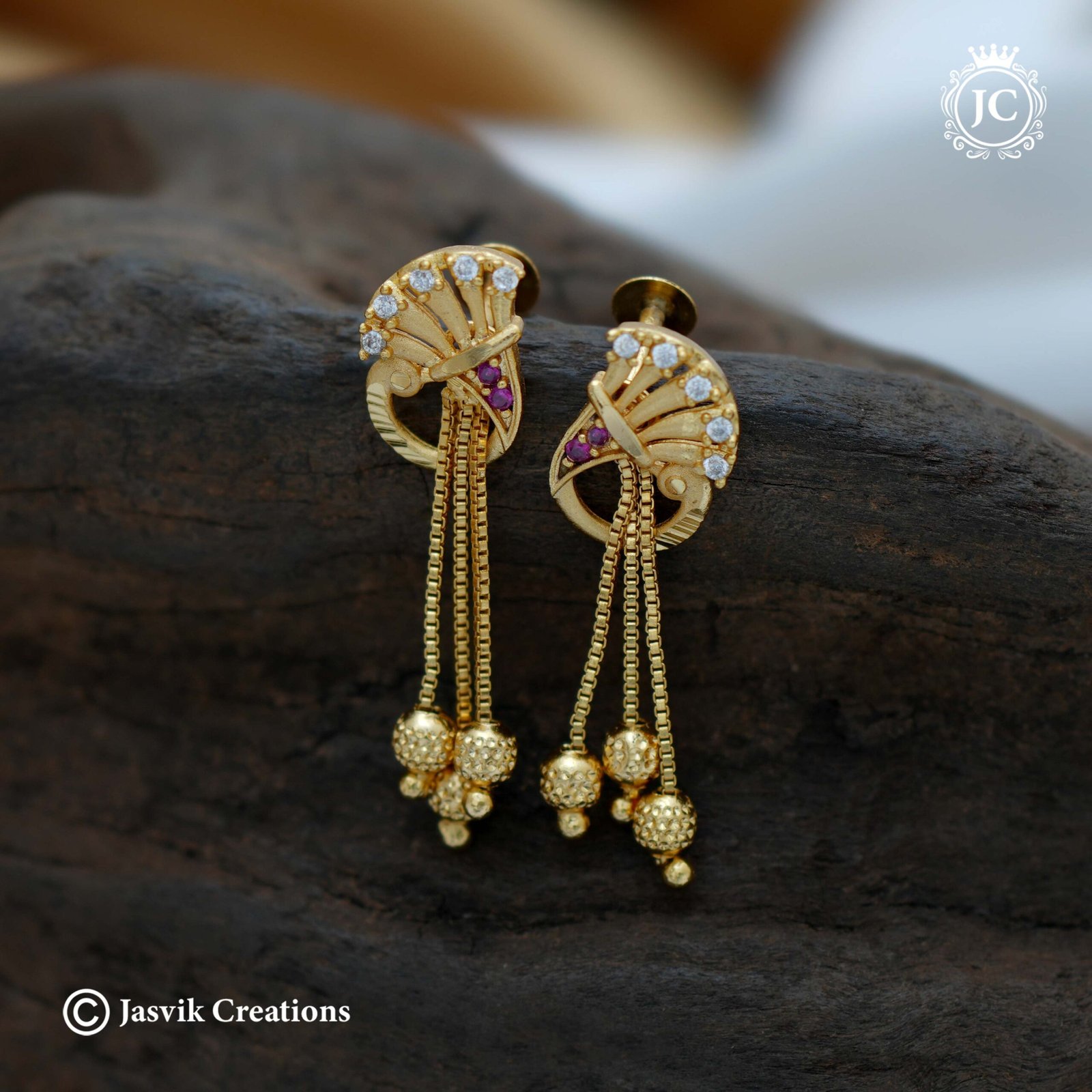 Elegant gold-toned dangle earrings featuring a curved or fan-like stud part. The stud is embellished with clear cubic zirconia stones and a few small ruby-colored accents. From the bottom of the stud, three fine chains hang down, each terminating in a textured gold bead.