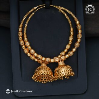 esign: It has a structured, tiered design resembling a small gopuram (temple tower) or a royal headpiece. The bottom edge is adorned with small, smooth hanging gold beads/drops.