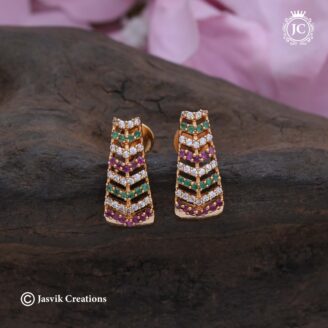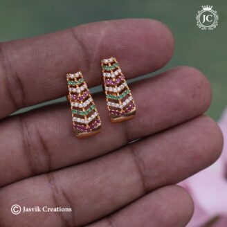 Embellishments: The central band features small, contrasting ruby (red), emerald (green), and white (CZ) stones, providing a pop of color typical of traditional Kemp or temple jewelry.