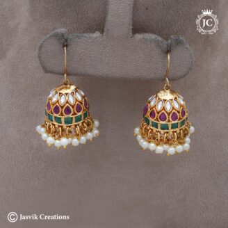 Embellishments: The central band features small, contrasting ruby (red), emerald (green), and white (CZ) stones, providing a pop of color typical of traditional Kemp or temple jewelry.