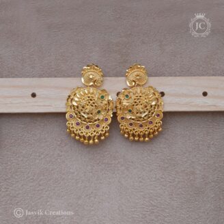 esign: It has a structured, tiered design resembling a small gopuram (temple tower) or a royal headpiece. The bottom edge is adorned with small, smooth hanging gold beads/drops.