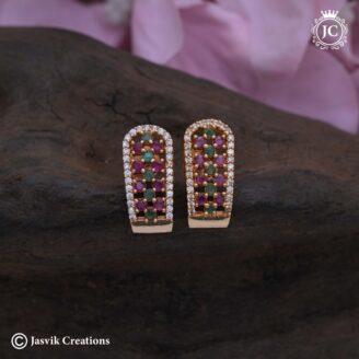 Embellishments: The central band features small, contrasting ruby (red), emerald (green), and white (CZ) stones, providing a pop of color typical of traditional Kemp or temple jewelry.