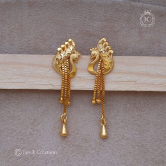 esign: It has a structured, tiered design resembling a small gopuram (temple tower) or a royal headpiece. The bottom edge is adorned with small, smooth hanging gold beads/drops.