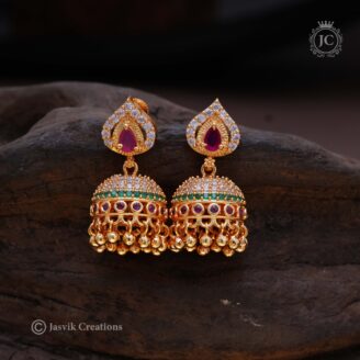 Embellishments: The central band features small, contrasting ruby (red), emerald (green), and white (CZ) stones, providing a pop of color typical of traditional Kemp or temple jewelry.