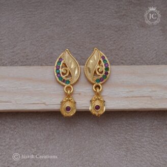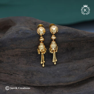 esign: It has a structured, tiered design resembling a small gopuram (temple tower) or a royal headpiece. The bottom edge is adorned with small, smooth hanging gold beads/drops.