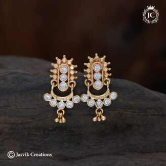 esign: It has a structured, tiered design resembling a small gopuram (temple tower) or a royal headpiece. The bottom edge is adorned with small, smooth hanging gold beads/drops.