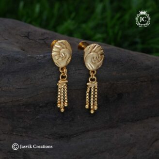esign: It has a structured, tiered design resembling a small gopuram (temple tower) or a royal headpiece. The bottom edge is adorned with small, smooth hanging gold beads/drops.