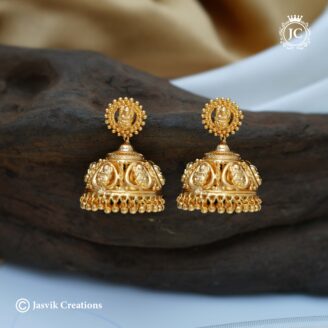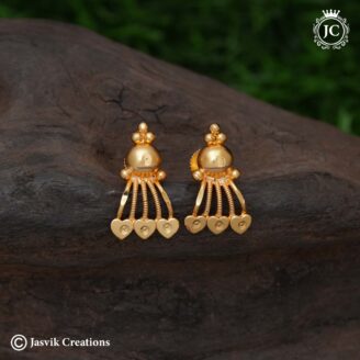 esign: It has a structured, tiered design resembling a small gopuram (temple tower) or a royal headpiece. The bottom edge is adorned with small, smooth hanging gold beads/drops.