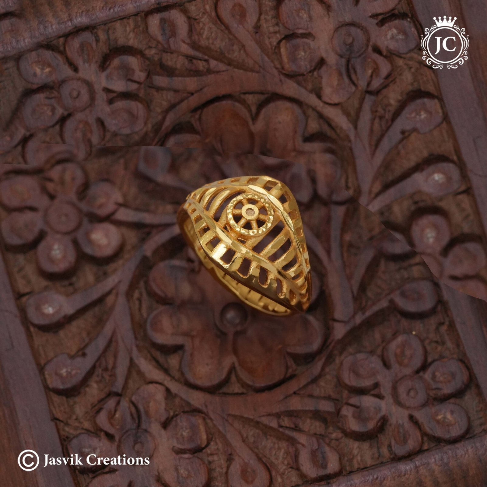 This is a feminine gold ring with a split-shank, layered design. The focal point is a row of three graduating gold hearts with a textured, faceted finish. These are overlaid by a straight bar set with pavé-set clear stones, creating a beautiful contrast between the shimmering gold and the brilliant stones.