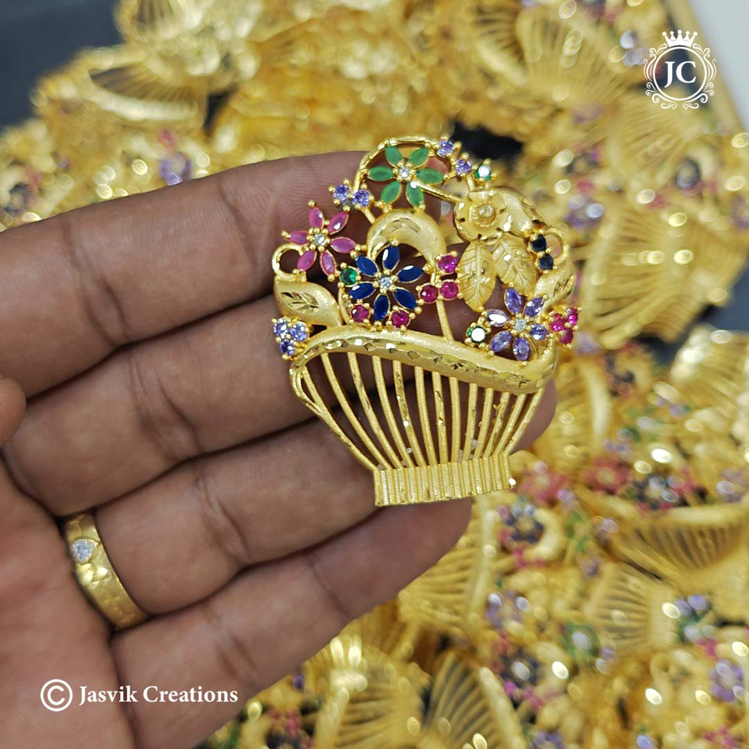 Stones and Embellishments: The centerpiece is its multi-colored stone setting. The flowers are studded with small, faceted stones in a range of vivid colors, including ruby (pink/red), sapphire (blue), emerald (green), and maybe amethyst (purple). This combination creates a striking and colorful visual contrast against the gold setting.