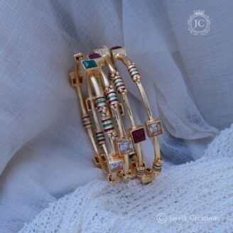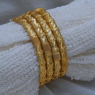 his piece is a set of bangles designed to replicate the classic style of gold bangles from the famous Indian jewelry brand GRT (G.R. Thanga Maligai). The bangles are a part of the “Jasvik Creations” line and are known for their high-quality finish, which gives them the appearance of genuine gold.