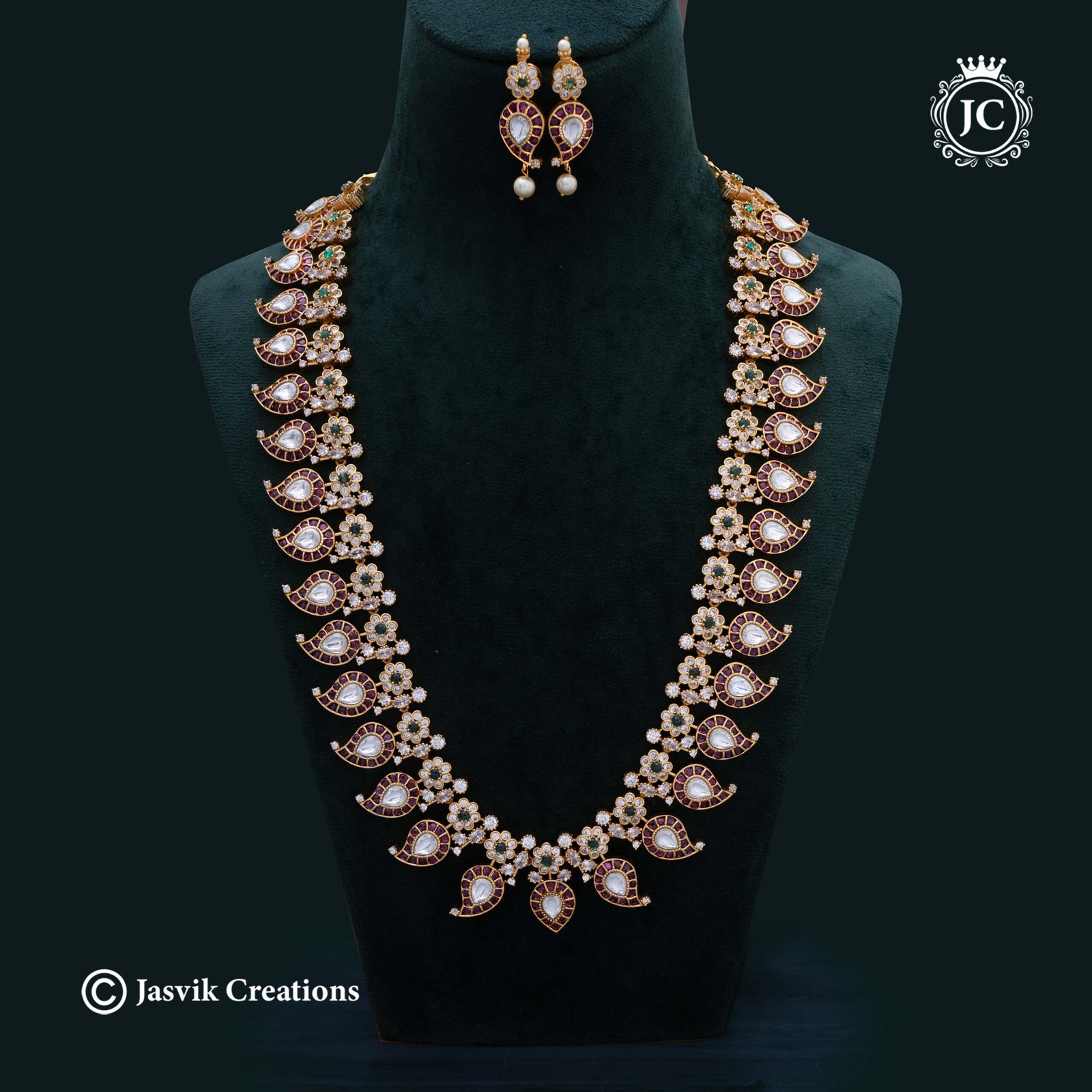 The haram is a long, continuous chain of repeating mango-shaped links. Each mango link is intricately detailed with a series of smaller, sparkling white stones, likely American Diamonds or high-quality cubic zirconia, creating a brilliant, diamond-like appearance. The outer edge of each mango link is bordered with small, circular red stones and green stones, which provide a beautiful color contrast.
