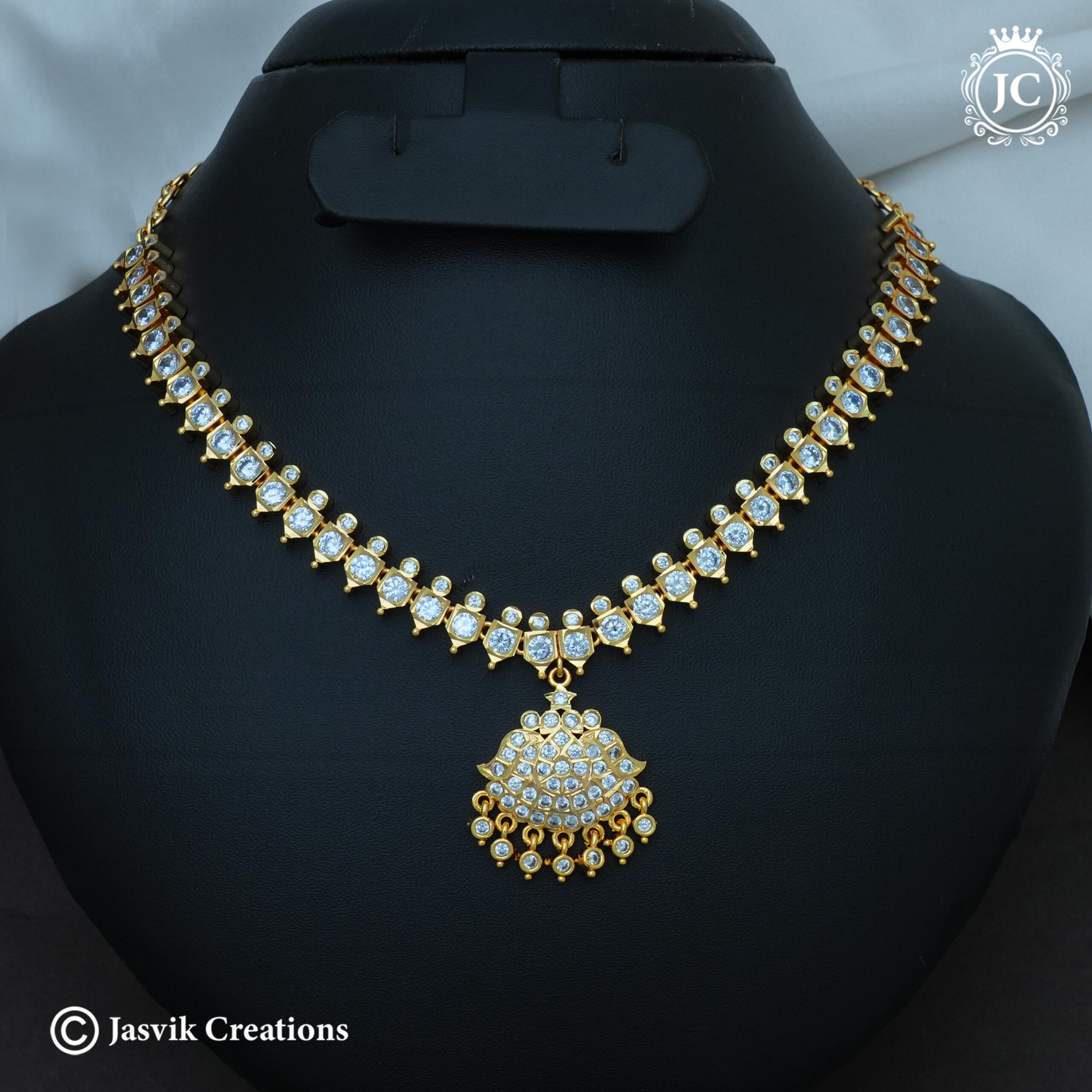 his Attikai necklace is crafted from Impon (a traditional five-metal alloy), known for its durability and resemblance to real gold. The design features a linear sequence of square-cut white CZ stones, each framed in a secure gold-toned setting. It is anchored by a stunning dome-shaped pendant fully encrusted with shimmering white stones and finished with delicate gold-bead clusters, creating a timeless and sophisticated look.