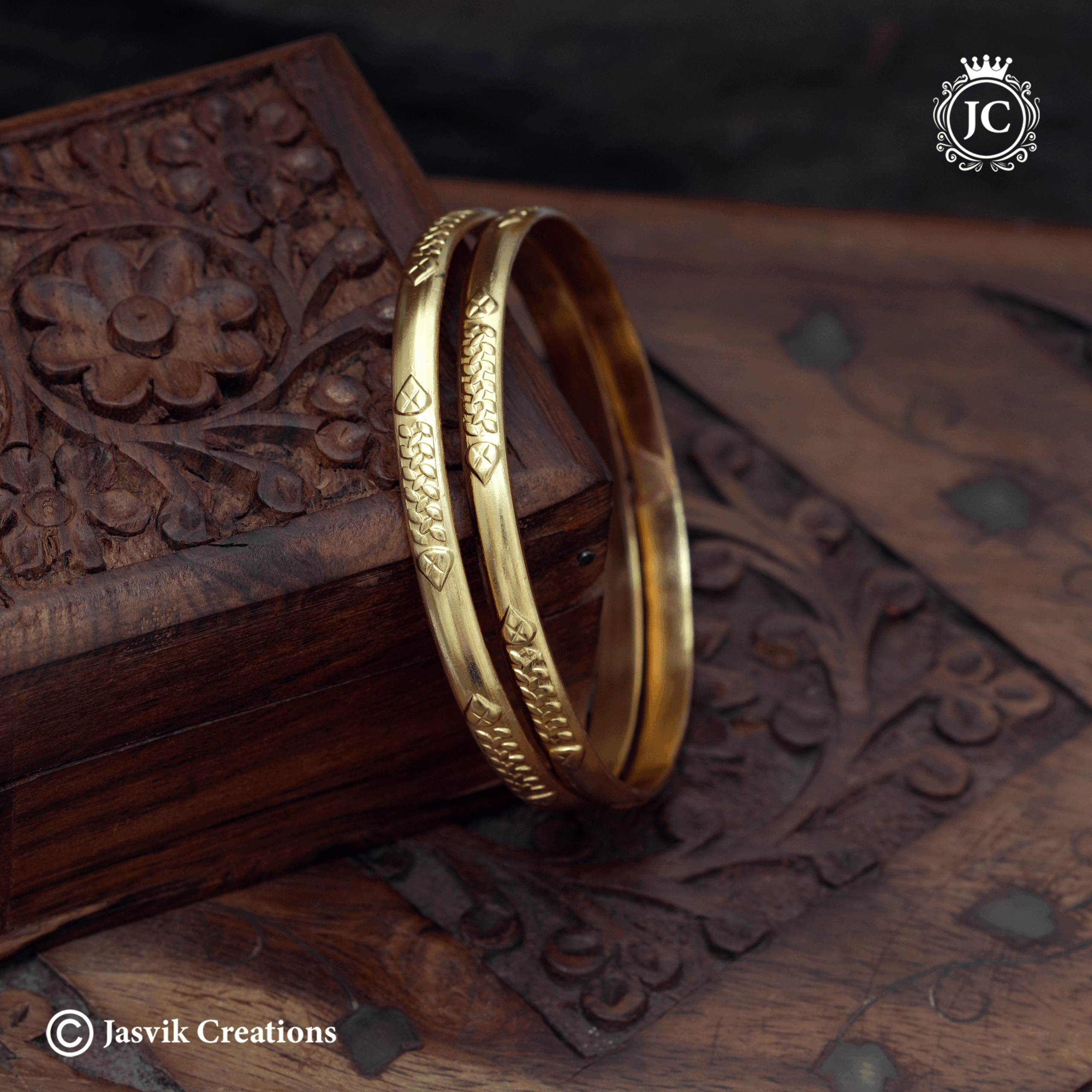 Finish: Described as “Without Polish” or Unpolished, meaning they have a subdued, matte gold tone initially. This finish is popular because the bangles are designed to gain a natural, real-gold-like shine over time and with regular wear, making them ideal for daily use.