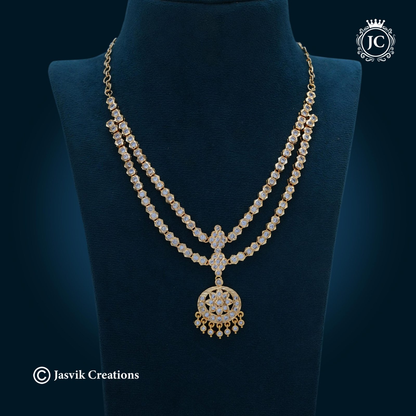 Chain/Neckline: It features two parallel lines of bright, clear, diamond-look stones set in a continuous, elegant pattern. This double-line design gives the piece significant sparkle and volume. The metal has an Impon (Panchaloha/Five-Metal alloy) or gold-tone finish.