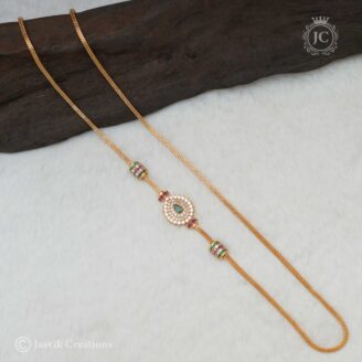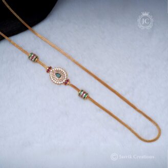This is a stunning Lakshmi Nakshi Haram in a traditional red color. The term “Nakshi” refers to the intricate, sculpted relief work on the metal, and “Lakshmi” specifies that the goddess of wealth and prosperity is featured as the central motif.