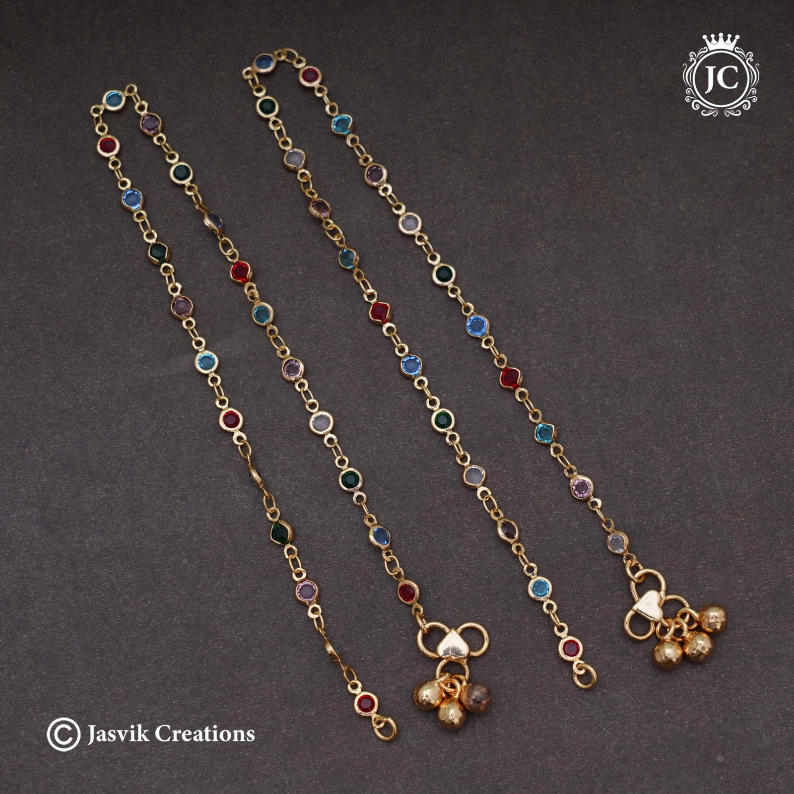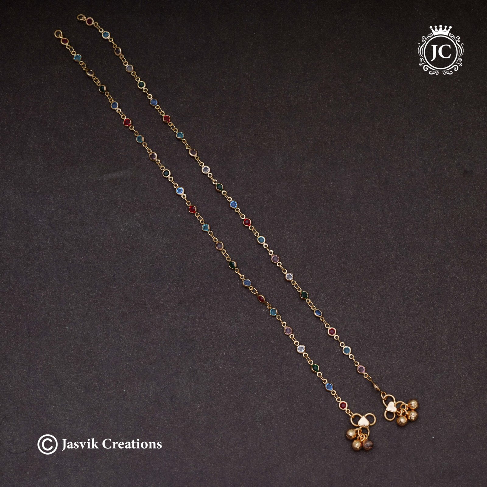 A vibrant fusion of tradition and artistry, these gold-toned anklets feature circular links accented with rich enamel hues—red, green, blue, and purple. Finished with triple-bead detailing, they offer a playful yet elegant touch, perfect for festive wear and cultural celebrations.