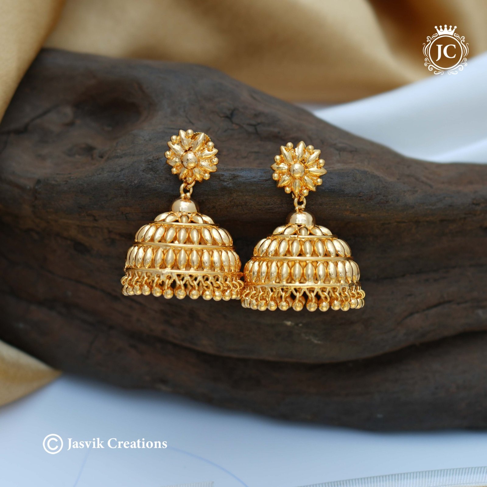 A charming pair of Big-sized jhumka earrings featuring a classic, bell-shaped design. The top post is a delicate floral stud from which the intricately detailed bell section hangs. The jhumka is decorated with vertical detailing and a lower fringe of small beads. The gold-tone finish suggests a micro-plated design, offering the look of traditional gold jewelry. These earrings are a perfect accessory for ethnic wear, providing a balance of traditional elegance and manageable size.