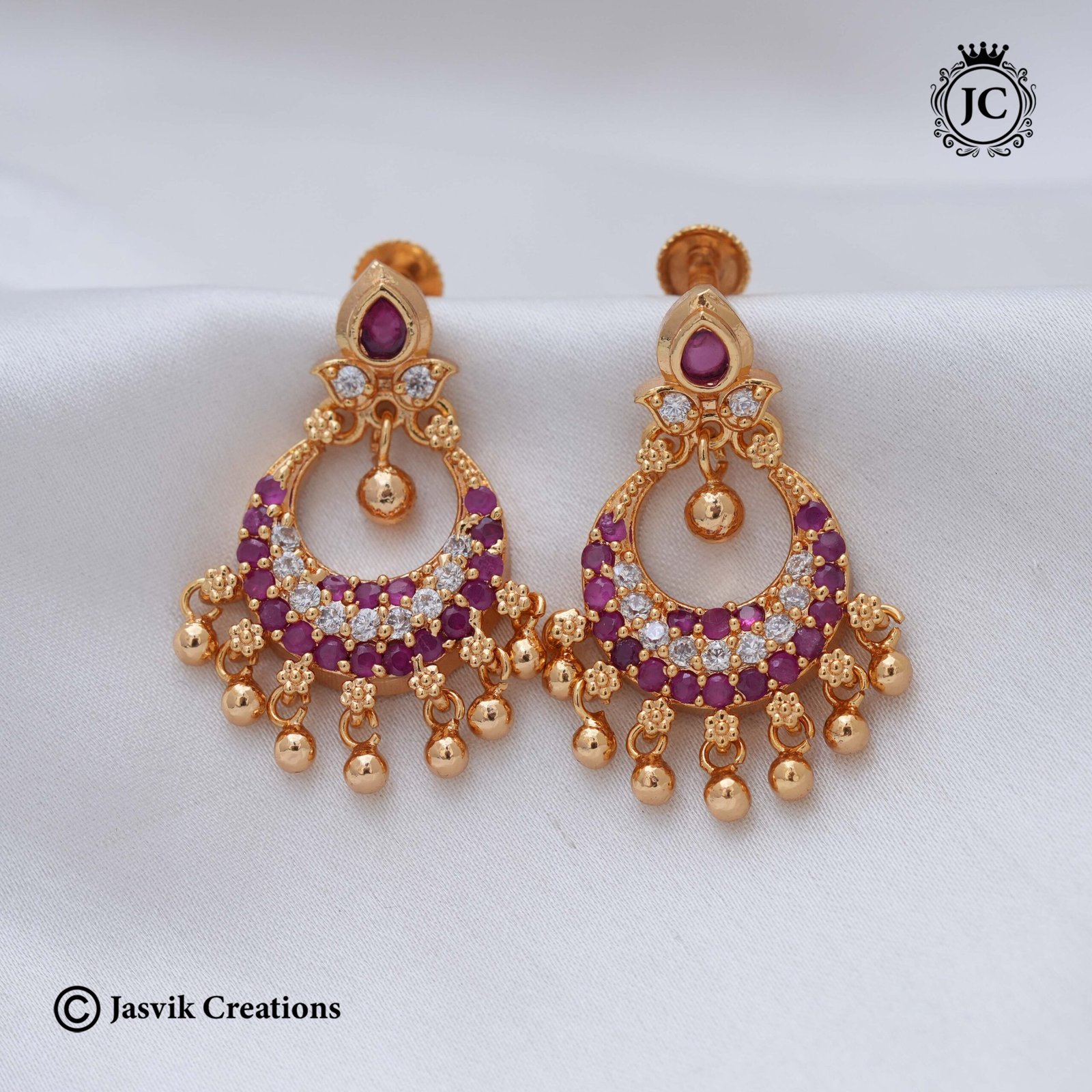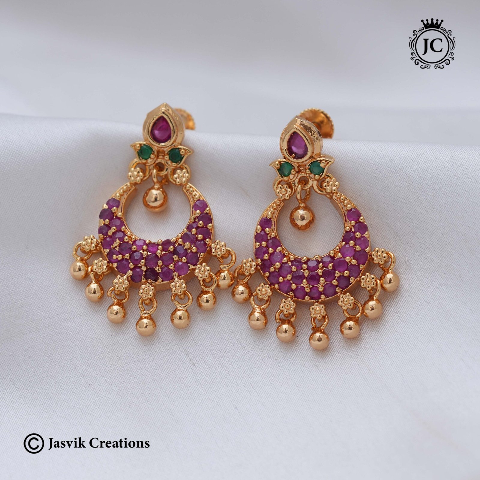 This is a vibrant and traditional pair of earrings known for the crescent moon shape, which is characteristic of the Chandbali style.