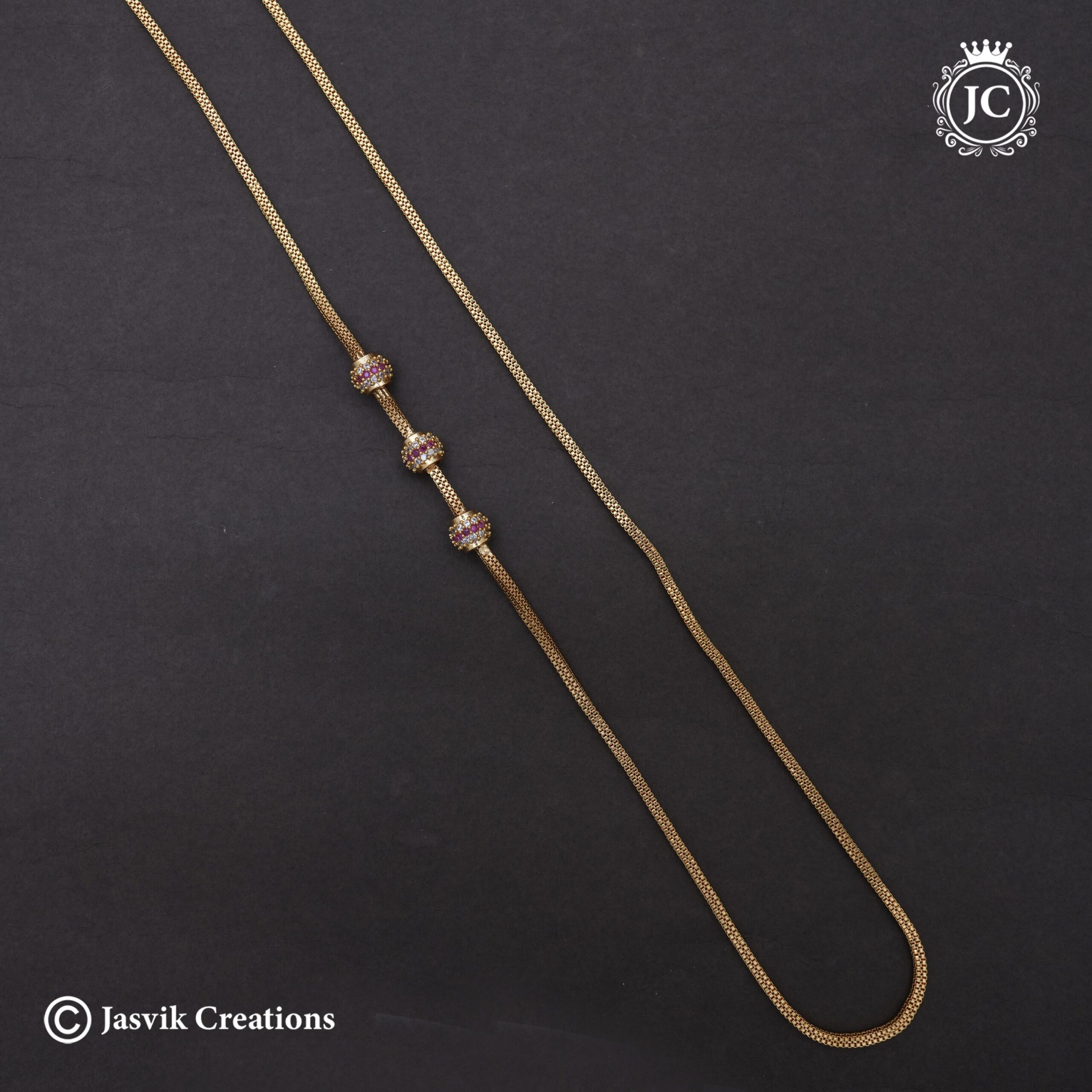 This Micro Plated Medium AD Ball Mugappu Chain (JCCH617) is a premium South Indian jewelry piece, designed to offer a timeless “gold look” with the added brilliance of high-quality stones. It is ideal for those who want a durable, elegant chain for daily use or festive gatherings.