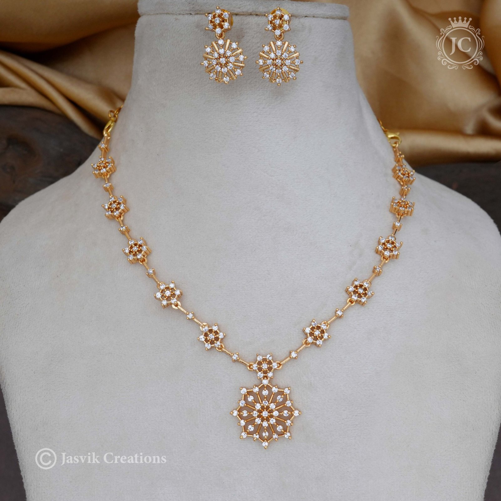 Matching Earrings: The set includes a pair of matching stud earrings. These earrings are small, star-shaped clusters of American Diamonds that perfectly complement the necklace’s design.