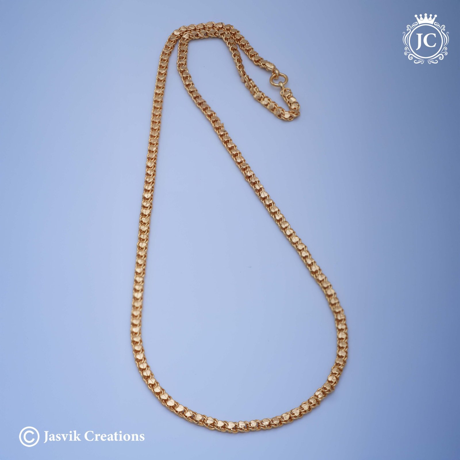 This chain is a lightweight, micro gold-plated chain with a fine thickness (typically 2mm to 4mm). The “Heartin” design refers to a pattern, often traditional, that incorporates small heart-shaped cuts or links. It is crafted to resemble real gold, making it suitable for daily use or casual to traditional occasions.