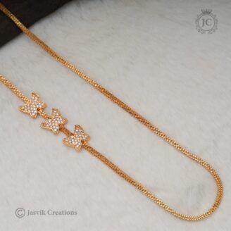 This Microplated AD Ball Mugappu Chain (JCCH614) is a stunning example of South Indian tradition meeting modern craftsmanship. Featuring a distinctive side pendant (Mugappu), this 24-inch chain is designed to be worn as a daily-wear thali chain or a statement ethnic necklace.