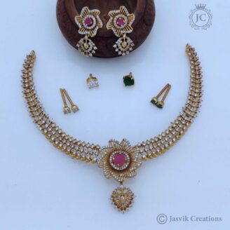 A Microplated Coral Necklace (often spelled Corel) combines the vibrant, traditional appeal of red coral with the durable brilliance of gold micro-plating. This set is a popular choice in South Indian fashion for its auspicious symbolism and high-end aesthetic.
