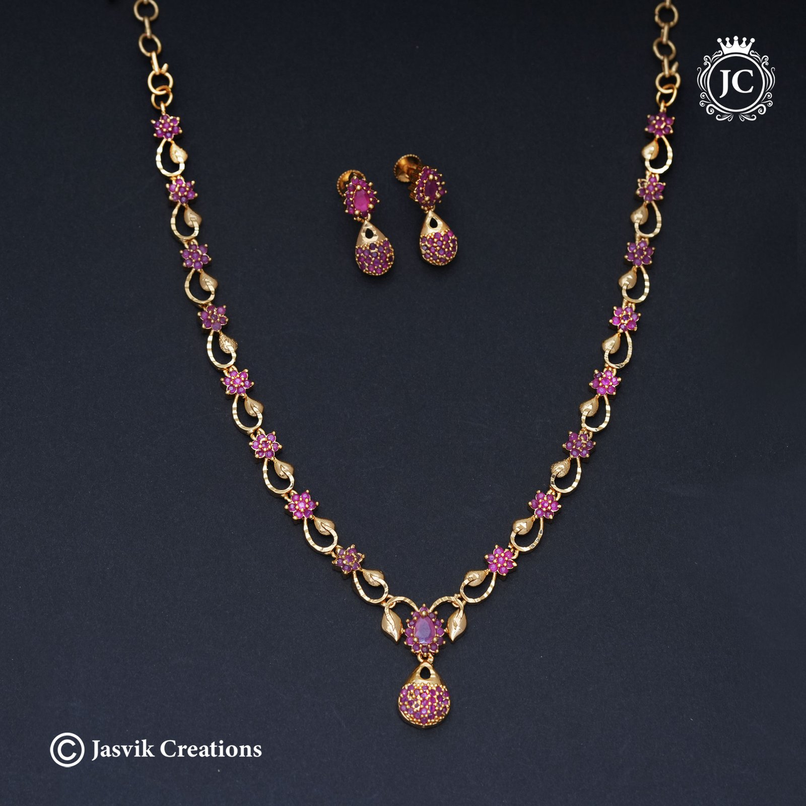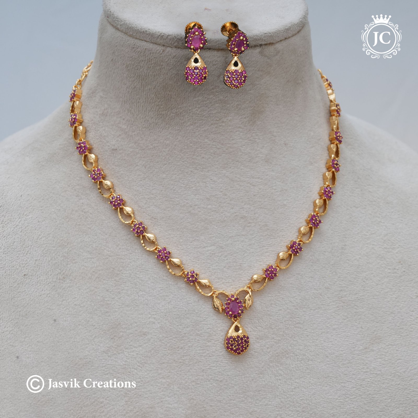 This is an elegant Microplated Drop Necklace set featuring a delicate chain with a central drop pendant, complemented by matching earrings.