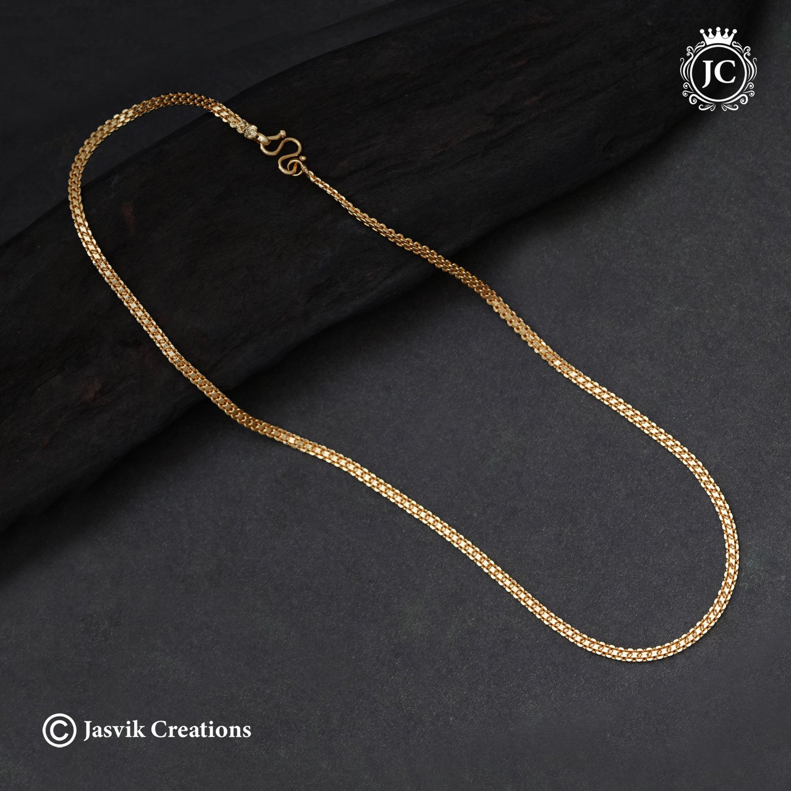 Design: Flat-Link Chain. The links appear to be small, uniform, and slightly flattened, giving the chain a sleek, somewhat solid appearance compared to round-link chains.