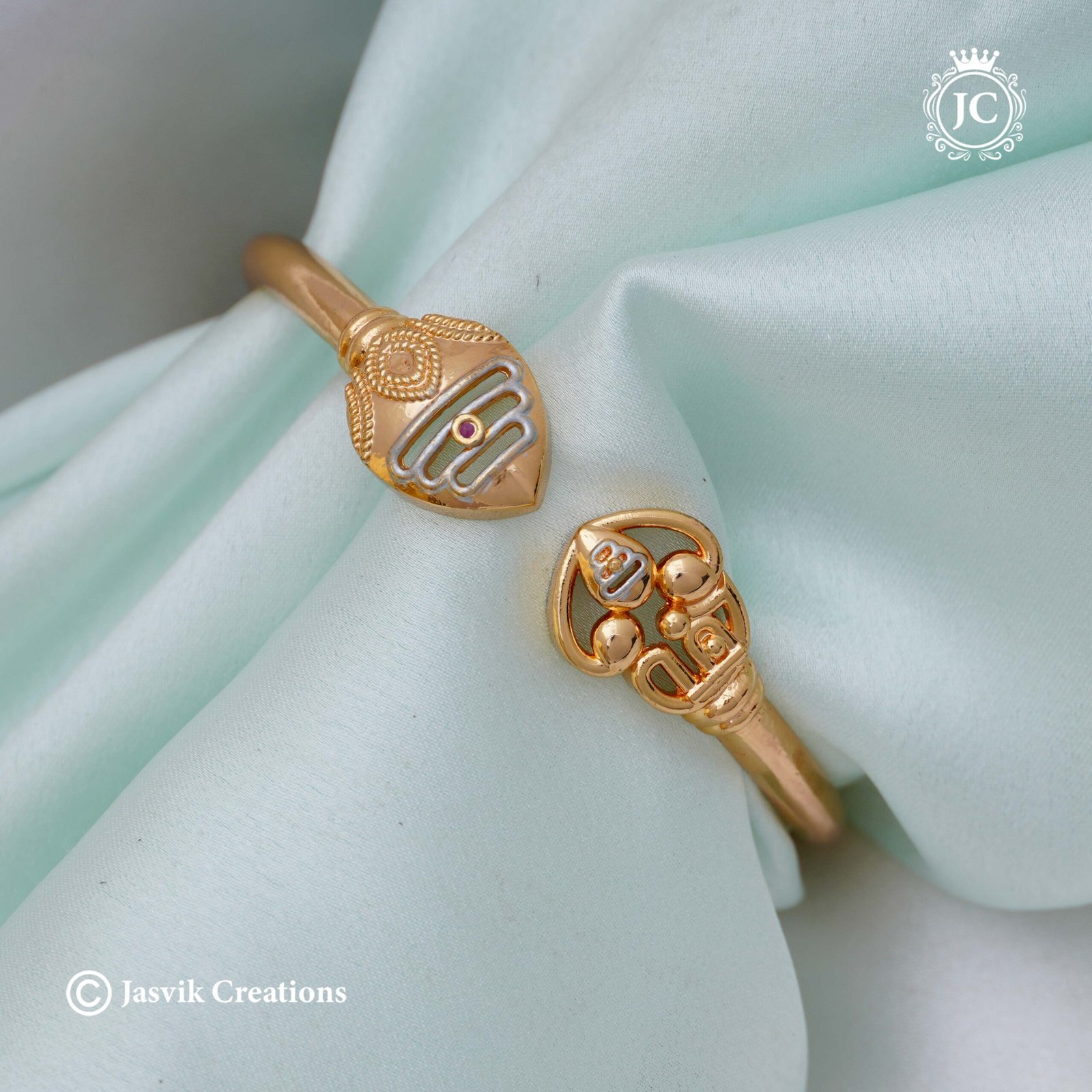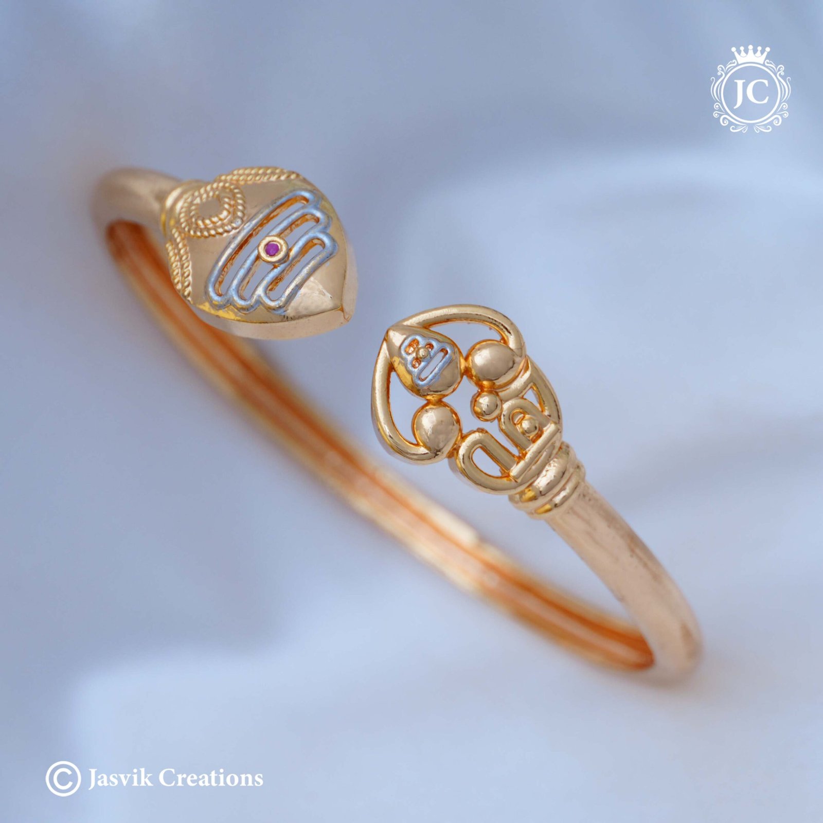 An open, adjustable Microplated Gold Kada (bangle/cuff) featuring traditional divine iconography. The design is characterized by stylized religious symbols at each end, such as an ‘OM’ or ‘Vel’ (Lord Murugan’s spear) motif with a central ruby-like stone, and is finished with an antique or matte gold texture. This piece is commonly worn as a daily-wear spiritual bracelet.