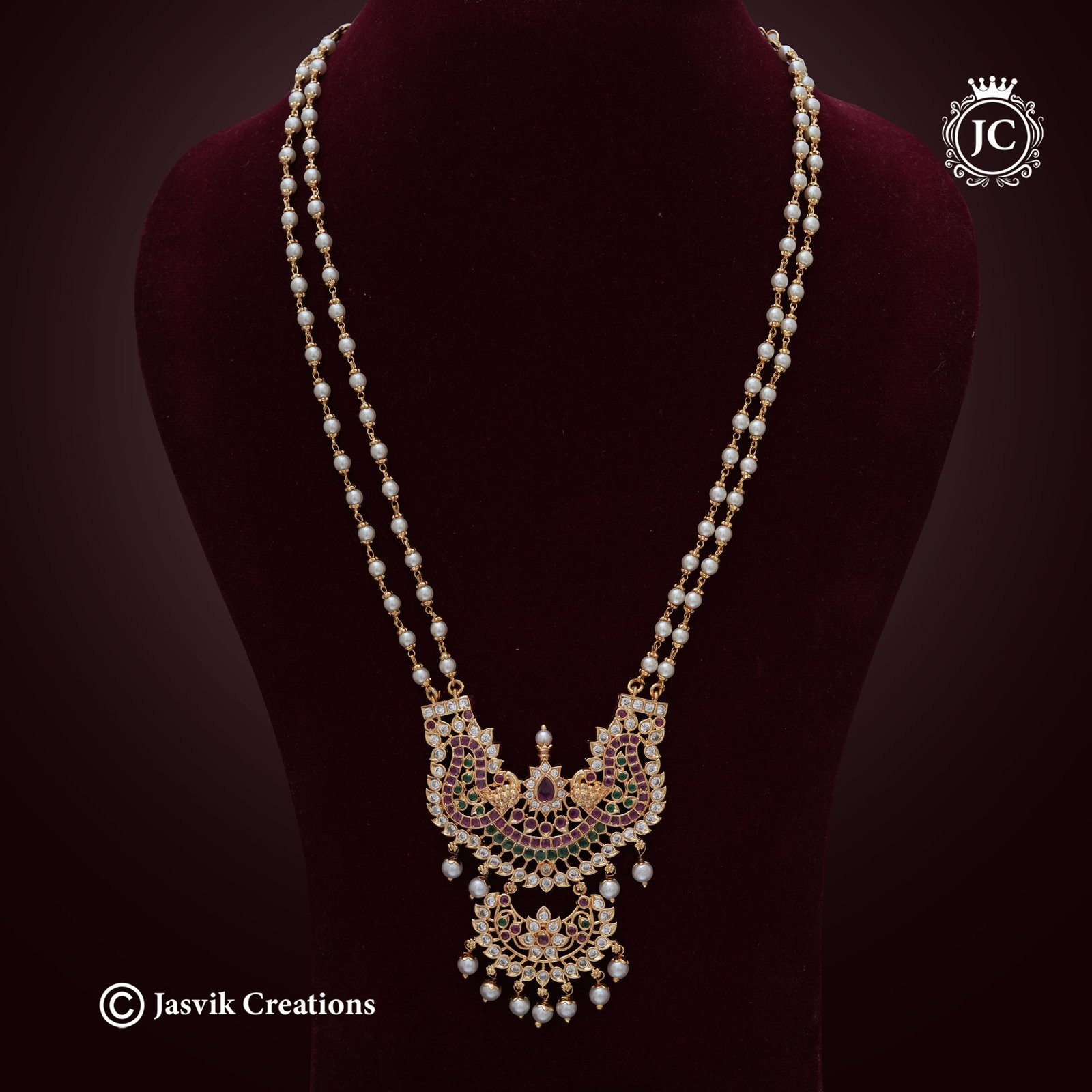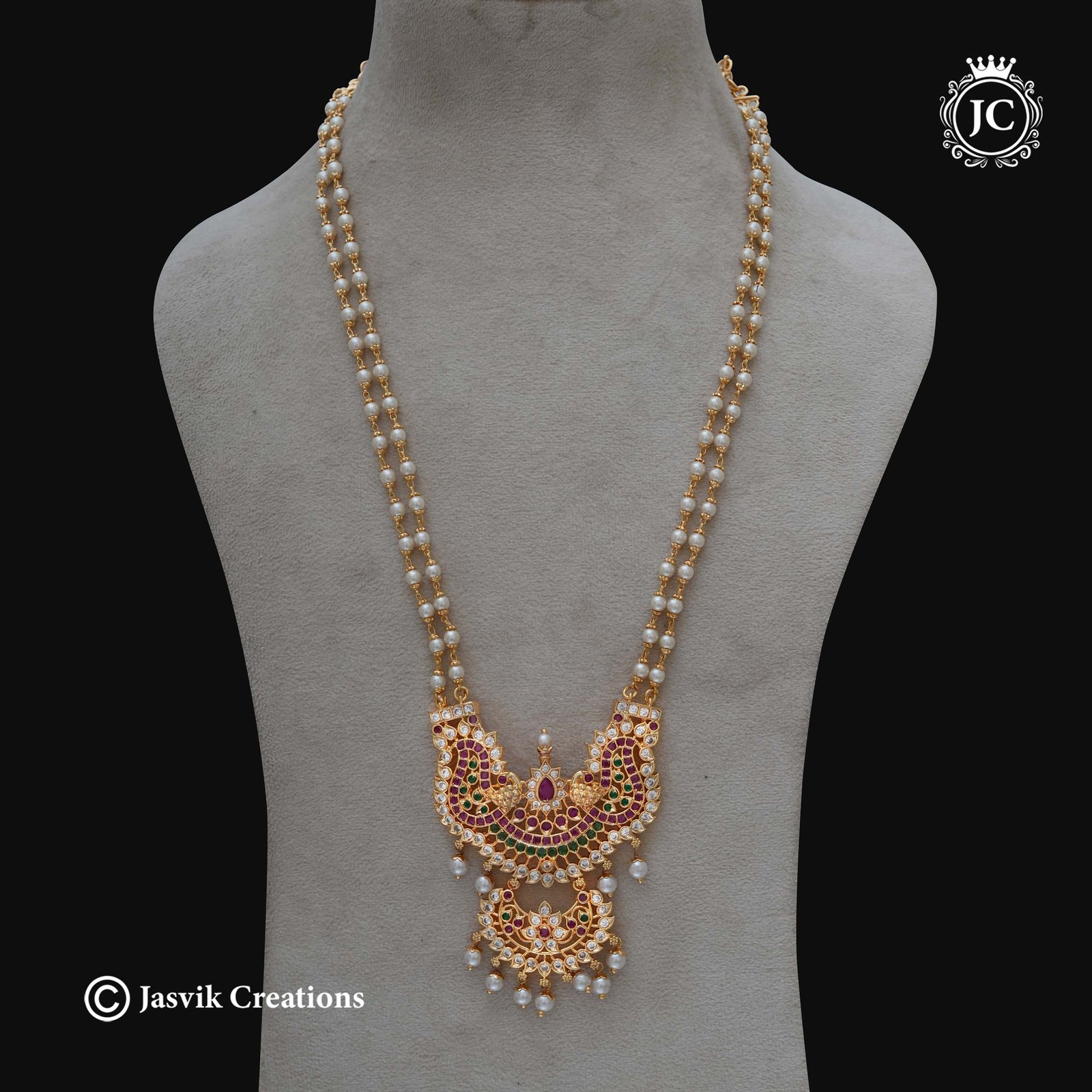 This is an exquisite Microplated Pearl Rani Haram (long necklace) featuring a traditional South Indian design.
