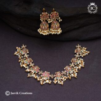 Beautiful micro-plated gold-tone haram (long necklace) set. The necklace features a central cluster of ruby-studded flower motifs leading to a fan-shaped pendant completely covered in ruby stones with dangling gold-tone bead drops. It is suspended from a textured chain and is paired with matching jhumka earrings topped with a floral stud.