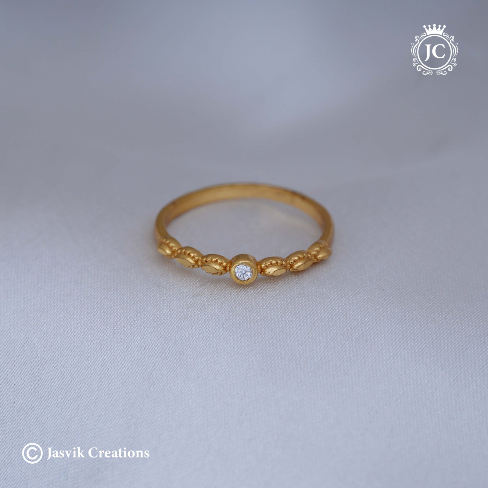 This is a simple and elegant Microplated Single Layer Finger Ring. It features a slender band with a repeating pattern of small, textured leaf-like or marquise-shaped gold elements adorning the front half. The central focal point is a single, small, bezel-set round stone, which adds a delicate sparkle to the design.