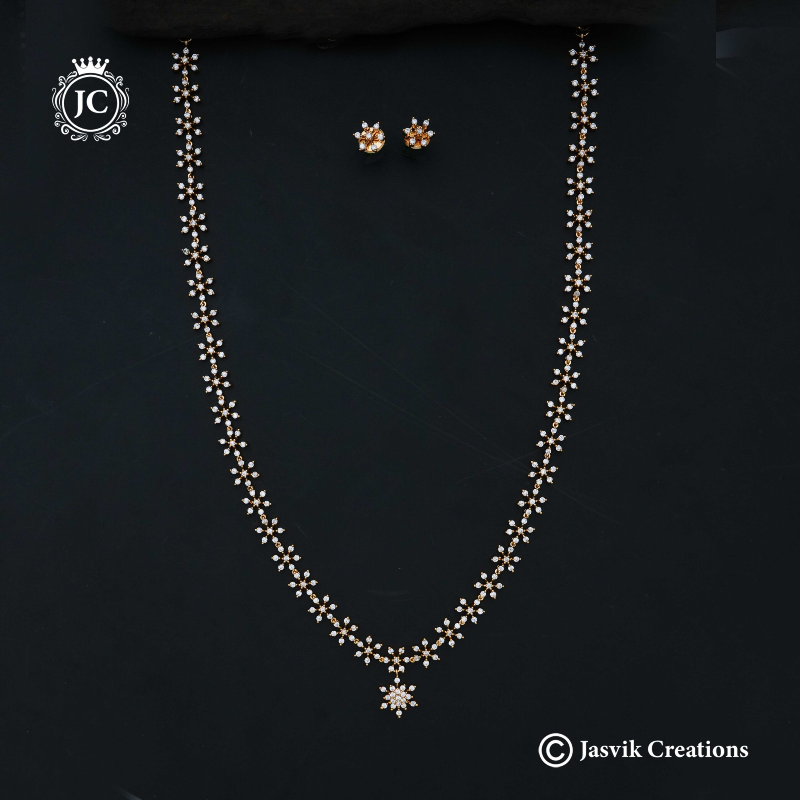 The Microplated Star Haram (JCHM213) is a stunning long-necklace that merges celestial charm with traditional South Indian grandeur. This “Gold-Copy” piece is designed to be a showstopper, offering a radiant, multi-dimensional look.