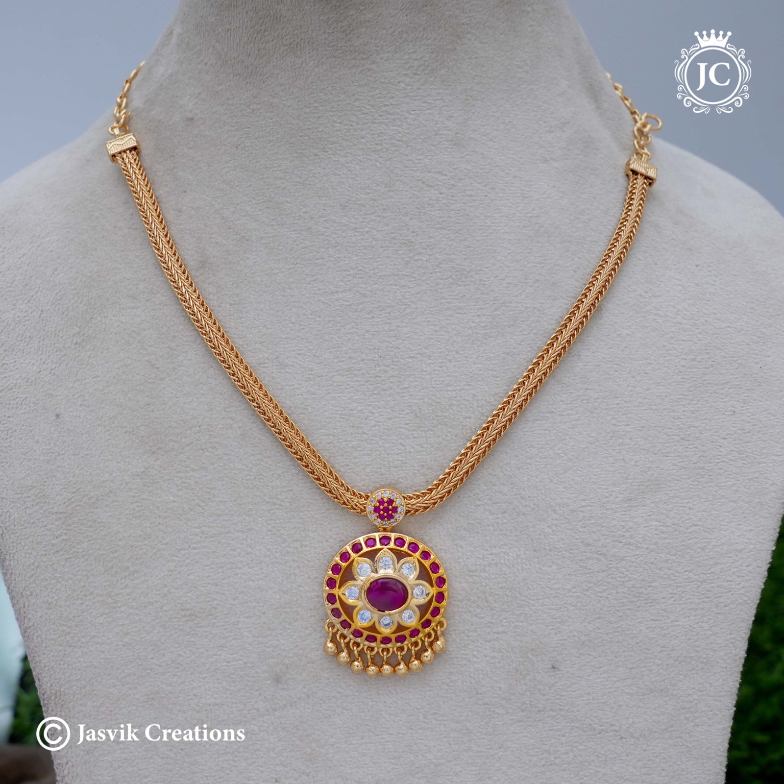 Stones: The center of each element is set with a small, prominent dark red or ruby-like stone (Kemp stone imitation) and surrounded by tiny white American Diamond (AD) stones for sparkle.