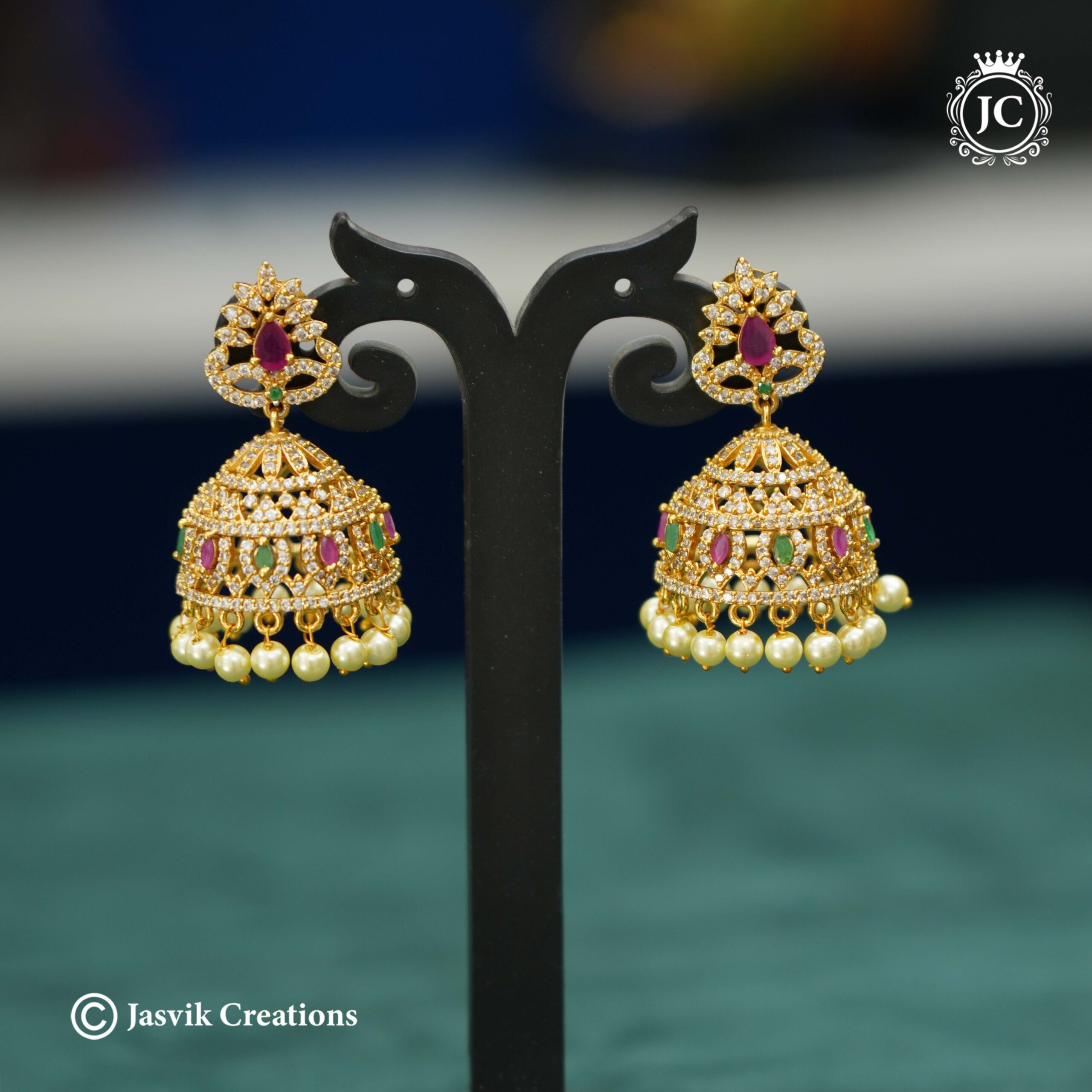 Bell (Jhumka): The main bell portion is studded with clear, ruby-red, and emerald-green stones in a detailed pattern.