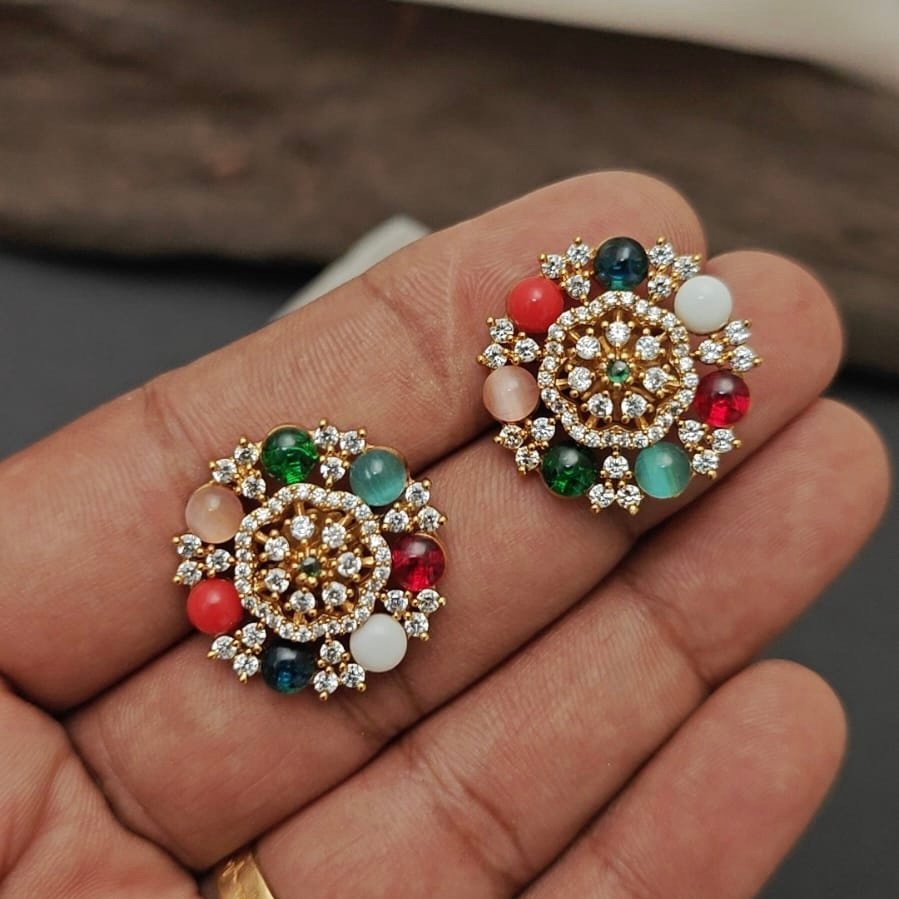 This is an ornate pair of traditional Indian stud earrings featuring a classic Navarathna (Nine Gems) design.
